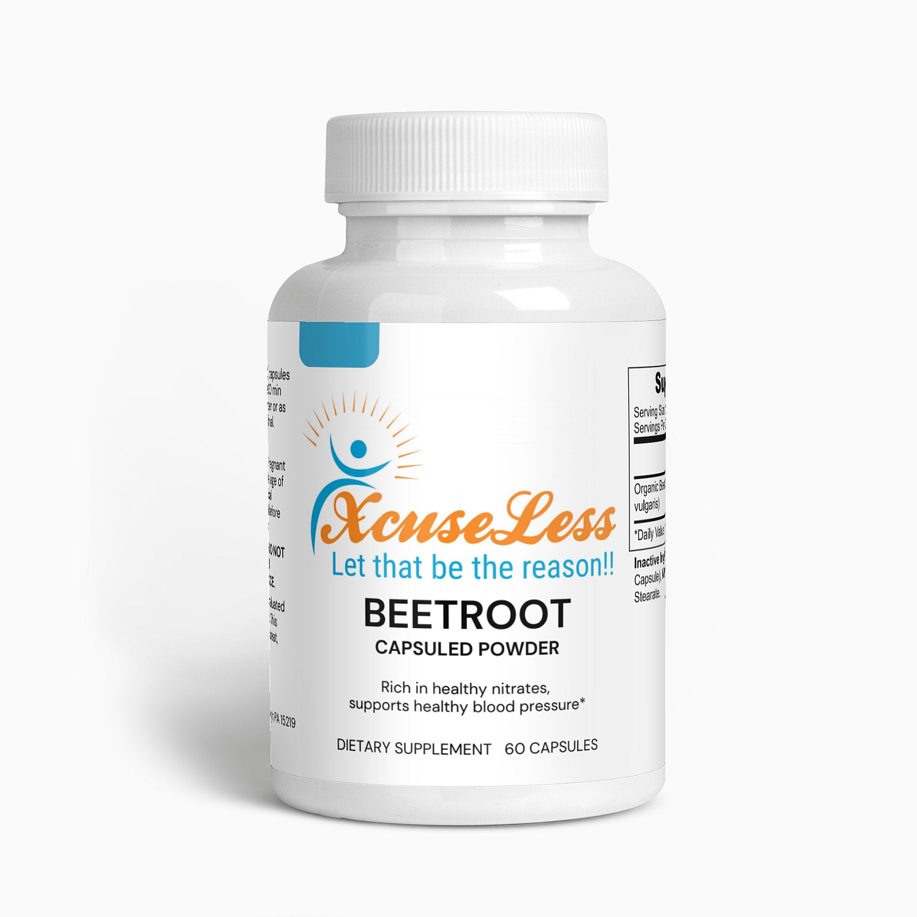 Ingredients: Organic Beetroot Powder (beta vulgaris), Cellulose (Vegetable Capsule), Microcrystalline Cellulose, Magnesium Stearate.